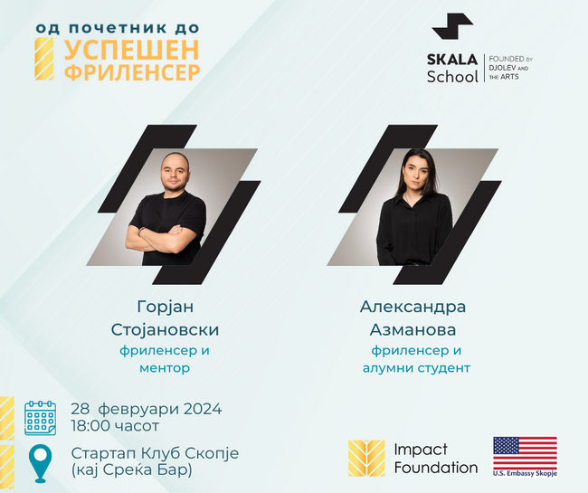 Овој пат партнери на настанот „Од почетник до успешен фриленсер“ се СКАЛА - Школа за дизајн, кои обезбедија двајца одлични говорници: