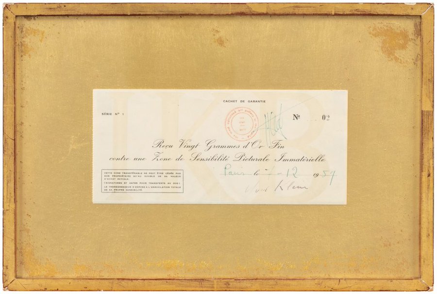 Малата сметка со широчина од помалку од 20 сантиметри потврдува сопственост на дело кое Клајн го нарекол „Зона на нематеријалниот сликовен сензибилитет“. Сметката била дизајнирана за да изгледа како банкарски чек и е потпишана од уметникот.