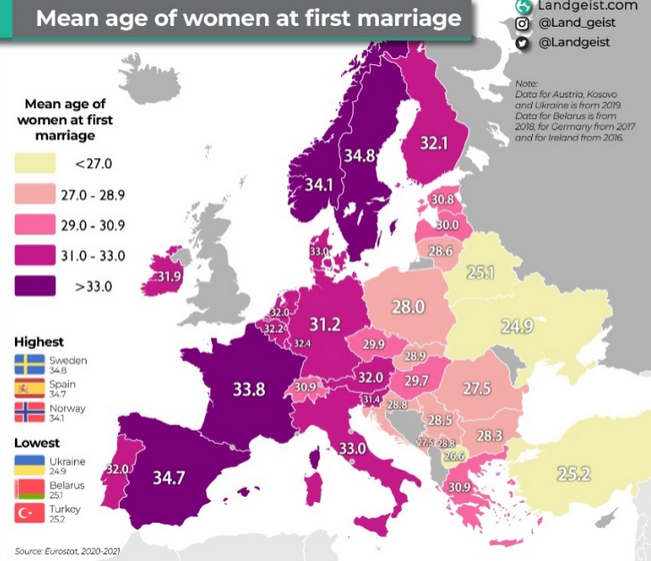 Во повеќето европски земји, жените стапуваат првпат во брак на над 30-годишна возраст. Забележлива е разликата во Западна и во Источна Европа, колку се оди позападно, толку е поголема просечната возраст.
