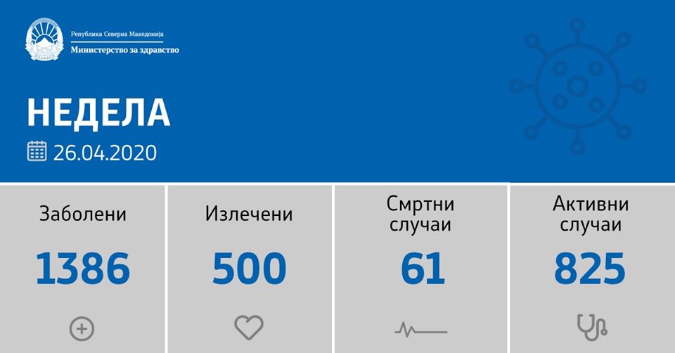 Во изминатите 24 часа направени се 335 тестирања, а потврдени се 19 нови случаи на Ковид-19 и тоа во: Скопје-3, Куманово -8, Прилеп -2, Струга -2, Велес -2, Гостивар-1, Виница -1. Со ова, вкупната бројка на Ковид-19 дијагностицирани во нашата земја изнесува 1386, од кои активни случаи се 825.