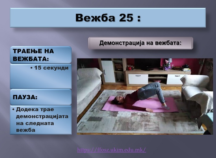 - Платформата „Зум“ е лесно достапна за сите, а благодарение на ФФОСЗ, сите професори добивме соодветна обука што успешно ја применуваме со студентите. Професорите преку видеозаписи подготвени во домашни услови изработија повеќе комплекси на вежби за истегнување, флексибилност, како и вежби за подобрување на силовите способности на рачно-раменската, градната, грбната, стомачната и ножната мускулатура. Сето ова е во функција на подобрување и развивање на моторичките способности и вештини, кои се во директна корелација со здравјето на младите - вели Крстевски.