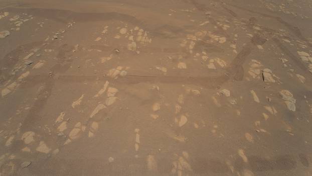 Така, на фотографијата може да се видат разни детали и траги од роверот „Персеверанс“, кој е верен сопатник на хеликоптерот.
