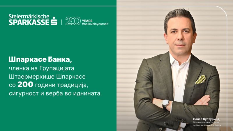 - Во 2025 година славиме 200 години постоење, историја и визија. Горди сме што Шпаркасе Банка АД Скопје е дел од банкарска групација Штаермеркише Шпаркасе со полни два века искуство, а истовремено предводник на новите генерации клиенти и вработени, кои гледаат кон иднината со сигурност и оптимизам. Нашата улога не е само финансиска, без разлика дали се млади корисници, мали бизниси или големи корпорации – ние сме присутни таму каде што навистина значи. Веруваме во долгорочни односи, па затоа нашата мисија останува иста, со нашите клиенти да бидеме партнер од доверба, кој ги разбира потребите на луѓето и активно придонесува кон развојот на заедницата – изјави г. Санел Кустурица, претседател на Управниот одбор на Шпаркасе Банка АД Скопје.