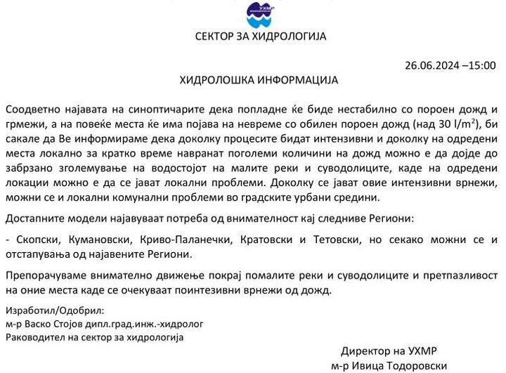 Управата за хидрометеоролошки работи издаде предупредување за утре, наведувајќи дека целата територија на Македонија ќе биде во портокалово ниво на опасност од невреме.