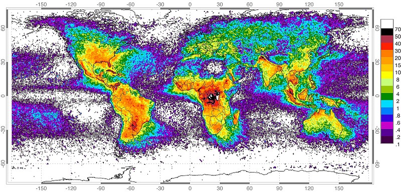 Просечен годишен број на молњи на километар квадратен низ светот, според НАСА