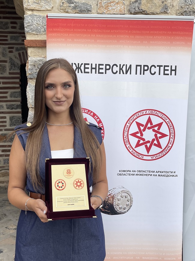 „Инженерскиот прстен е круна на моето досегашно образование и еден вид печат на сите години труд, истрајност и љубов кон професијата“, вели Сара Панева од Факултетот за природни и технички науки на Универзитетот „Гоце Делчев“ во Штип по добивањето на наградата „Инженерски прстен“.