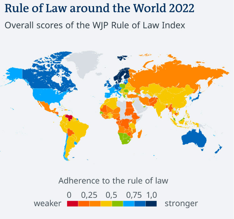 Од 2009 година индексот на вашингтонската невладина организација „World Justice Project“ го мери развојот на владеењето на правото, врз основа на осум фактори: ограничувања на владините овластувања, отсуство на корупција, отворена влада, фундаментални права, ред и безбедност, регулаторно спроведување, граѓанска правда и кривична правда. За овогодишниот Индекс на владеење на правото беа анкетирани повеќе од 154.000 домаќинства и 3.600 правни експерти.