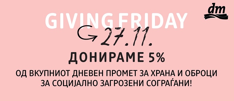 Во период кога сите на пазарот се насочени кон вртоглава потрошувачка и попусти, компанијата dm дрогерие маркт одлучи и оваа година, на т.н. „Црн петок“ да му даде ново значење, така што ќе донира 5% од целиот остварен промет на 27 ноември во хуманитарни цели. Оваа донација ќе биде реализирана во форма на пакети со храна кон организацијата „Ајде Македонија“ со цел обезбедување храна и оброци за социјално загрозени сограѓани.