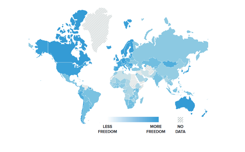 Гледано по региони, највисоки индекси на човековите слободи има во Северна Америка, Западна Европа и Источна Азија, а најниски на Блискиот Исток, Северна Африка, Потсахарска Африка и Јужна Азија.