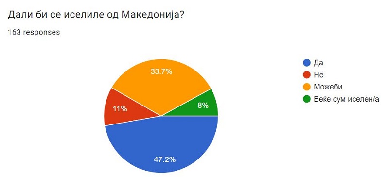 Имено, вкупно 47,2 отсто од испитаниците што одговориле на нашата анкета би се иселиле од Македонија, а 33,7 отсто се на два ума и велат дека можеби би го направиле тоа. За 11 отсто, иселувањето не е опција, а 8 отсто веќе го направиле тој чекор.