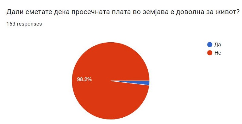 Само 1,8 отсто од испитаниците сметаат дека просечната плата во земјава е доволна за живот, додека за преостанатите 98,2 отсто таа не е доволна.