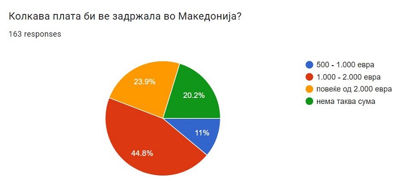 За да останат да живеат во Македонија, на 44,8 отсто од испитаниците им е доволна плата од 1.000 до 2.000 евра. За 23,9 отсто, потребна е плата повисока од 2.000 евра, 20,2 отсто не би останале да живеат во Македонија за ниедна сума, додека 11 отсто се задоволни и со плата од 500 до 1.000 евра.