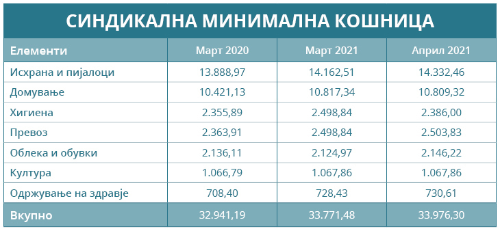 - Во синдикалната минимална кошница не се вклучени трошоците за рекреација, образование, хотели и ресторани, семејни прослави, не затоа што не се потребни, туку затоа што во кошницата се пресметуваат само неопходните трошоци. Промените на цените се исто така динамични. Особено варираат регулираните цени на струјата, парното, водата, кои минатата година отидоа нагоре, што ги зголемува животните трошоци. Последните податоци говорат дека синдикалната кошница за април 2021 година е зголемена за 204 денари во споредба со претходниот месец поради евидентното зголемување на индексите на трошоците за живот за април, и тоа на исхрана и пијалаци за 1,2 отсто, облека и обувки за 1 отсто и хигиена за 1,1 отсто. Вредноста на кошницата за април изнесува 33.976 денари. ССМ оправдано бараше минималната плата да изнесува најмалку 60 отсто од просечната. Ниту просечна, а ни две минимални плати не ја покриваат синдикалната кошница. За овие трошоци, на едно четиричлено семејство му недостигаат 3.596 денари, па оттука усогласувањето на висината на минималната плата не требаше да биде со надгласување на работниците - велат од ССМ и дополнуваат дека усогласувањето на минимална плата за 235 денари, наместо за 446 денари колку што бараа, е занемарливо поради растот на цените на храната и пијалаците, обувките и хигиенските производи кои се составен дел од кошницата.