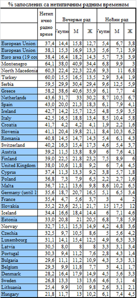 Во Црна Гора вкупно 64,1 отсто од населението има нетипично работно време. На третото место, веднаш по Македонија, е Турција, каде 60 отсто од населението има нетипично работно време, а потоа следуваат Србија и Грција со 59,5 и 58,2 отсто.