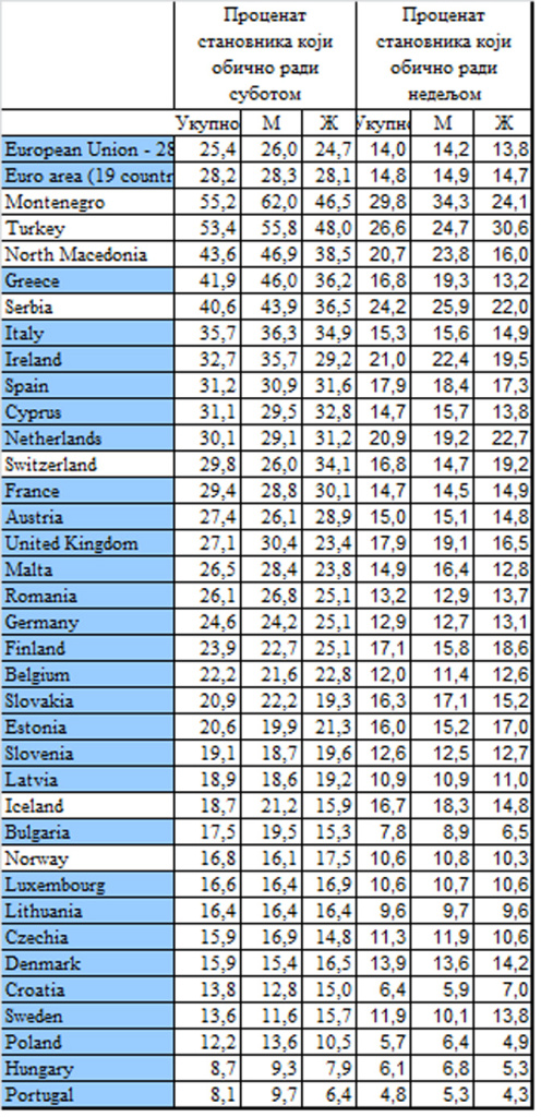 Повисок процент од нас имаат само Турција и Црна Гора. Во Турција 53,4 отсто од населението работи во сабота, а 26,6 отсто работи во недела. Црногорците, пак, се покажале како највредни, па од табелата може да се види дека 55,2 отсто од населението во Црна Гора работи во сабота, додека 29,8 отсто работи во недела.