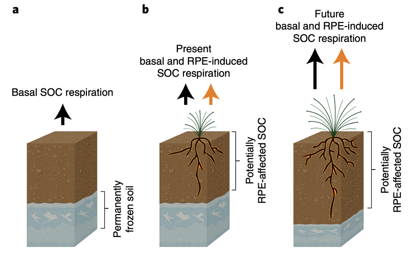 Првпат истражувачите комбинираа податоци со висока резолуција и за ширењето и за длабочината на клучни растенија што растат на арктичкиот пермафрост за да утврдат колку јаглерод испуштаат тие. Поради тоа што сè повисоките температури стимулираат дополнителен раст на растенијата, истражувачите проценуваат дека ризомската подготовка ја засилува општата респирација на микроорганизмите во почвата за околу 12 отсто. До 2100 година тоа значи апсолутна загуба на околу 40 милијарди тони на јаглерод од северниот пермафрост.