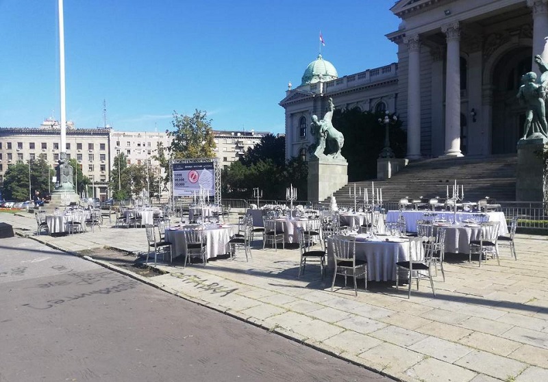Секој што вчера поминал пред српското Народно собрание не можел да не ги забележи свечено декорираните маси пред зградата, со огромни свеќници и богато декорирани цветни аранжмани.