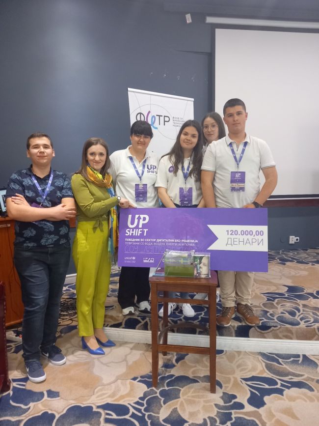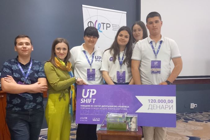Теона Алексова, Елизабета Златкова, Натали Веселиновска, Борис Шалевски, Гаврил Гацов се учениците од СОУ „Љупчо Сантов“ – Кочани што ја освоија главната награда за идејно решение за справување со климатските промени и заштита на животната средина на буткампот на UPSHIFT програмата.