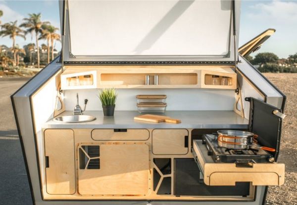Одредени модел исто така имаат и надворешна кујна со фрижидер, мијалник со рачна пумпа, полица за зачини, шкафче, фиоки и шпорет со две грејни плочи, а најскапиот