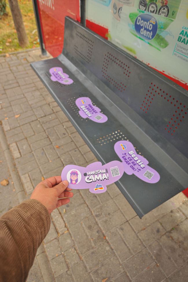 • Во ноември, dm дрогерие маркт спроведе и герила активност. Неколку фреквентни автобуски постојки во Скопје осамнаа „украсени“ со лепенки во облик на менструални влошки со пораките: „Сè ќе биде ОК“, „Јас и ти можеме сè“ и „Никаде без Bestie“ и QR код кој води до голема база на податоци, информации, истражувања и едукативни содржини подготвени од dm за сите девојки и жени.