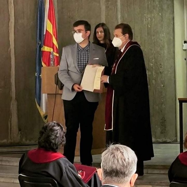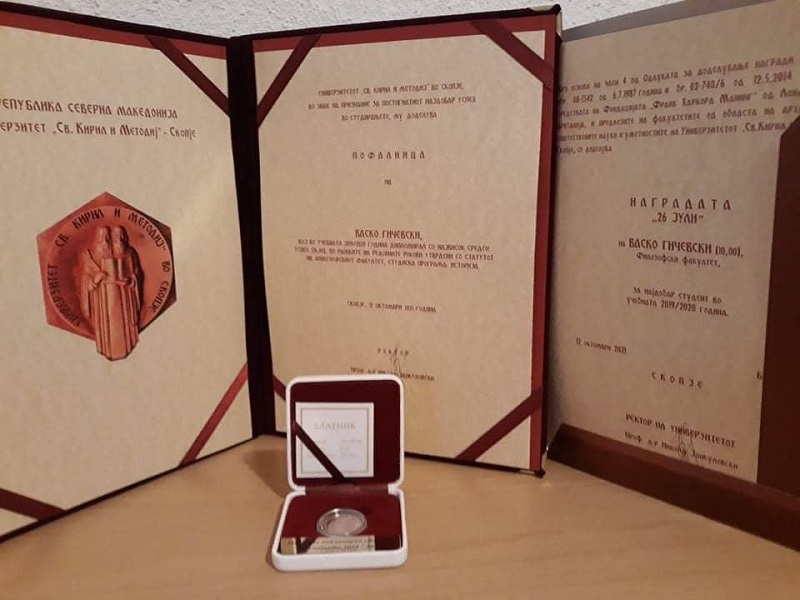 - Студиите на Институтот за историја ги започнав во 2016 година, ги завршив во рок, со просек 10. Добитник сум на признанието за најдобар дипломиран студент на УКИМ во учебната 2019/2020 и наградата „26 Јули“ од фондацијата „Франк Манинг“ за особен успех во студирањето. Во моментов не сум запишан на последипломски студии - објаснува тој.