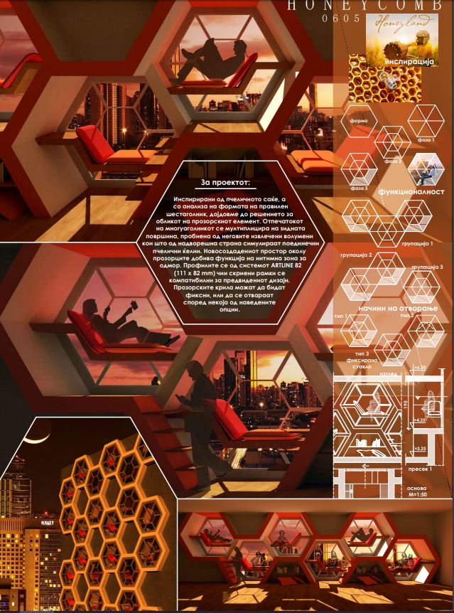 Она што е уникатно кај овој прозорски елемент е што отпечатокот на многуаголникот се мултиплицира на ѕидната површина, пробиена од неговите извлечени волумени кои од надворешна страна симулираат поединечни пчелични ќелии. Новосоздадениот простор околу прозорците добива функција на интимна зона за одмор. Прозорските крила можат да бидат фиксни или да се отвораат според некоја од наведените опции.