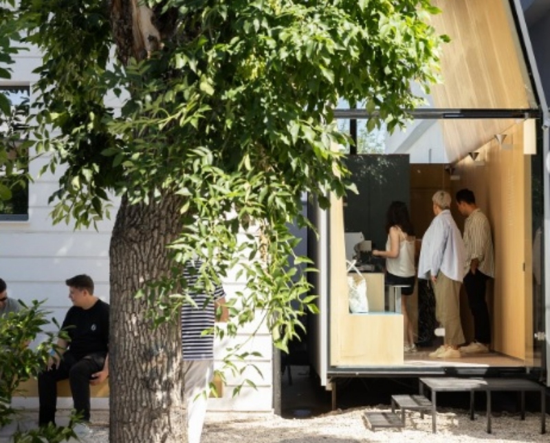 И покрај ограничувањата на просторот, малата кафетерија од само 18 квадратни метри одржува визуелна транспарентност по должината на улицата, со оглед на тоа што има големи стаклени површини и челични панели. Со својата необична форма изгледа како скулптура.