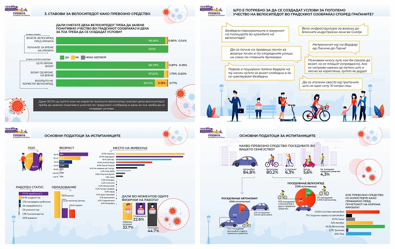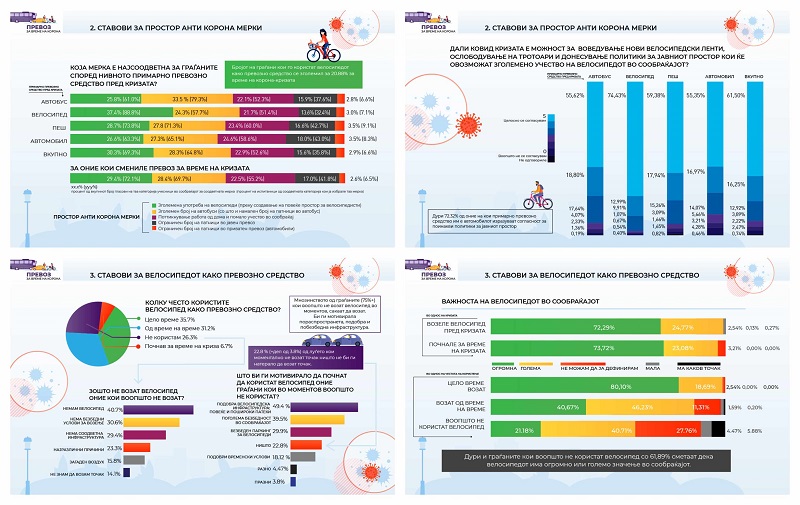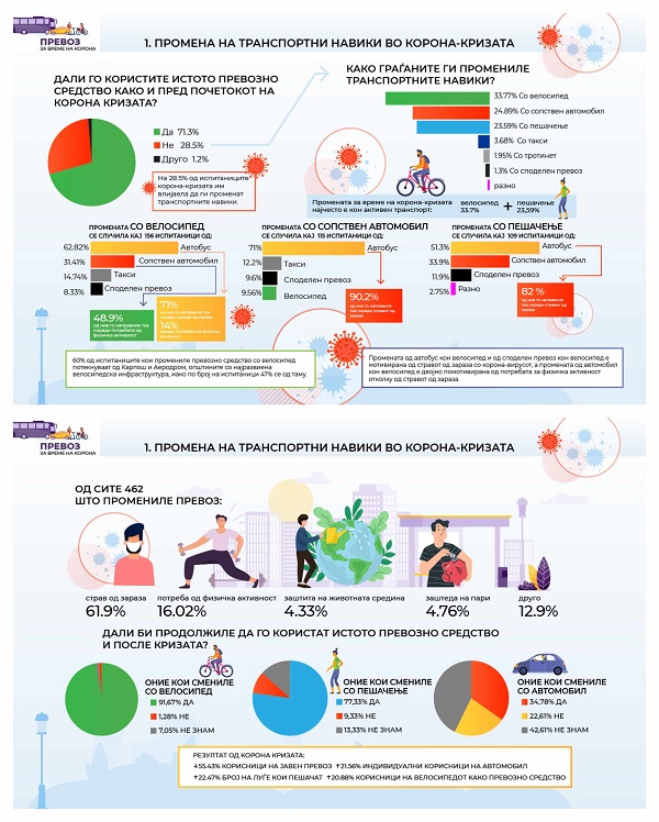 - Од испитаниците што го промениле превозот, 33,7% и 23,59% промениле друг тип превоз со велосипед и со пешачење, соодветно. Најголем дел од нив потекнуваат од јавниот превоз (62,82% и 51,35%, соодветно), но и од индивидуалниот превоз со автомобил (31,41% и 33,9%) и споделениот превоз со автомобил (8,33% и 11,9%). Промената од автобус и од споделен автомобилски превоз кон велосипед и пешачење е мотивирана од стравот од зараза со коронавирусот (слично и промената од јавен превоз кон автомобил), а промената од превоз со сопствен автомобил кон велосипед е помотивирана од потребата за физичка активност. Може да заклучиме дека стравот од зараза (61,09% од случаите) бил главна причина за промена на транспортните навики, на второ место (16,02%) потребата за физичка активност, а потоа и: заштитата на животната средина, заштедата на средства и други причини - посочуваат од „На точак“.