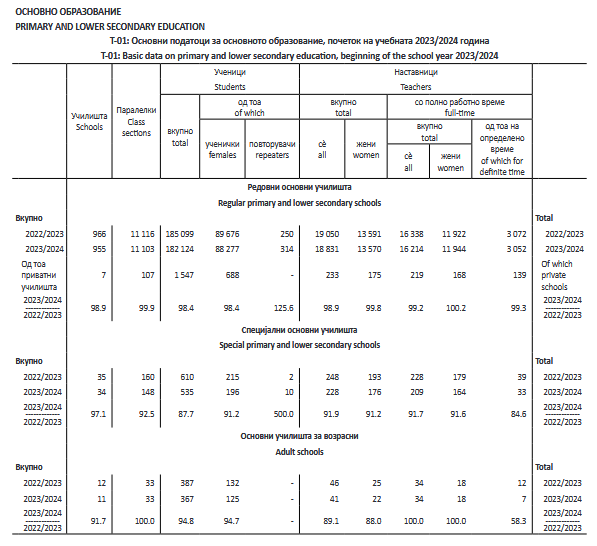 На почетокот на учебната 2023/2024 година бројот на учениците во редовните основни училишта изнесува 182.124, што претставува намалување за 1,6% во споредба со претходната учебна година, покажуваат податоците на Државниот завод за статистика. Бројот на учениците во редовните средни училишта, на почетокот на учебната 2023/2024 година изнесува 67.278, што претставува намалување за 2,8% во споредба со претходната учебна година.