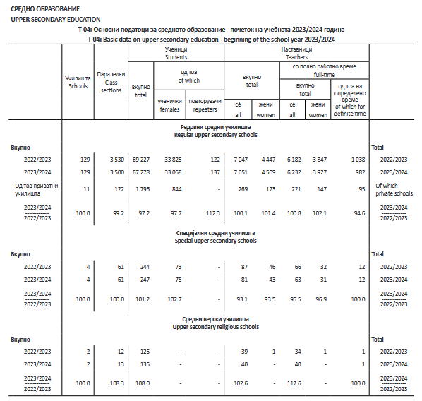 Во однос на средното образование, може да се забележи дека бројот на училиштата е ист како лани, но бројот на паралелки е намален за 30, од 3.530 на 3.500. Бројот на средношколци, пак, е намален за 1.949 ученици, од 69.227, колку што биле лани, на 67.278. Сепак, бројот на наставници расте и од 7.047, колку што имало лани, пораснал на 7.051, од кои 4.509 се жени. Од вкупниот број наставници 6.232 се со полно работно време, покажуваат податоците.