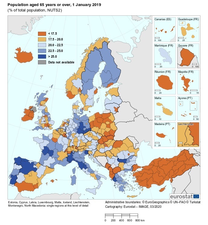 податоци за староста на населението во 2019 година по региони. Минатата година 20,3 отсто од населението во ЕУ имало повеќе од 65 години, што е раст на уделот од 0,3 процентни поени во споредба со 2018 година и раст за 2,9 процентни поени во споредба со 2009 година.