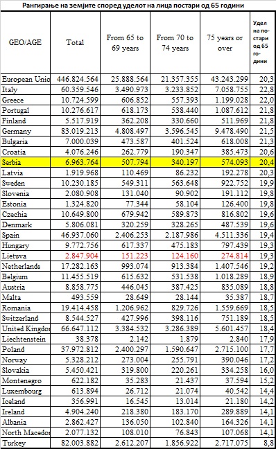Македонија е под просекот на Европската Унија со 14,1 отстотен удел на лицата постари од 65 години. Податоците покажуваат дека од вкупно 2.077.132 жители, во нашата земја минатата година имало 108.010 лица на возраст меѓу 65 и 69 години, 76.843 лица на возраст меѓу 70 и 74 години и 107.068 лица постари од 75 години.