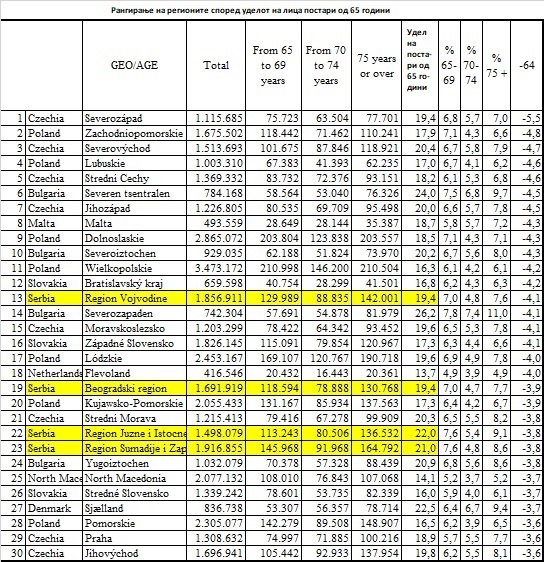 Најголем удел на населението постаро од 65 години, според региони, има во Кемниц (28,9%) во Германија, Лигурија (28,5%) во Италија, Епир (27%) во Грција, Лимоузен (26,7%) во Франција и Саксонија-Анхалт (26.5%) во Германија. Првите три региони имаат поголем број лица постари од 75 години од оние на возраст од 65 до 74 години.
