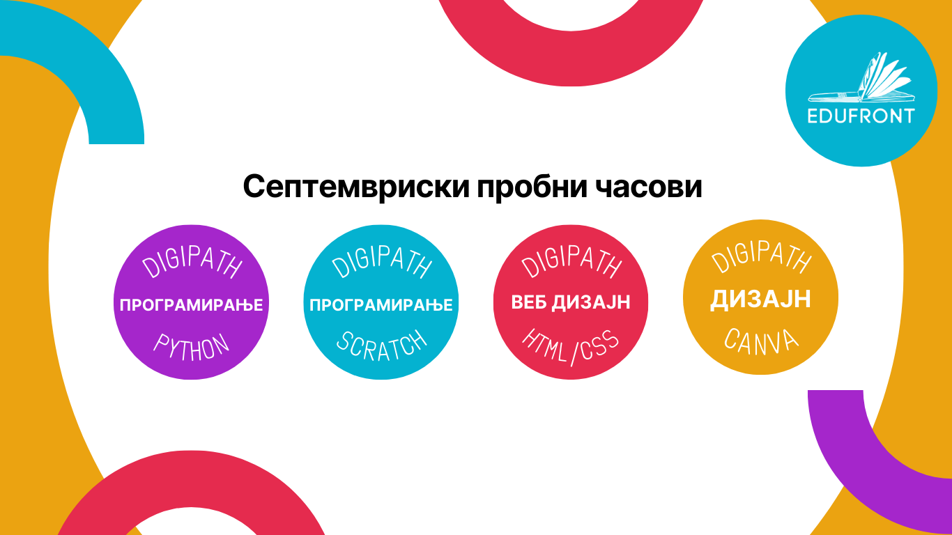 Едукативниот центар за деца Едуфронт најавува бесплатни, отворени, воведни часови за онлајн обуките од Digipath - дигитални патеки за програмирање, веб-дизајн и дизајн. Ваквите отворени настани веќе станаа традиција на Едуфронт и редовно се организираат четврта година по ред, на почеток на секоја училишна година. Преку нив им се дава можност на децата да се запознаат со неколку дигитални вештини и да стекнат основни знаења од нив, соодветни за нивна возраст.