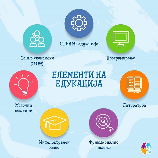 3. Развој на животни вештини: IQ UP! едукацијата им помага на децата да развијат животни вештини како што се: логичко размислување, критичко размислување, креативност, решавање проблеми, фокус, меморија, самодоверба, љубопитност, комуникациски и презентациски вештини. Овде учениците учат како да учат, како да размислуваат и како да го користат целиот свој интелектуален потенцијал.