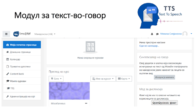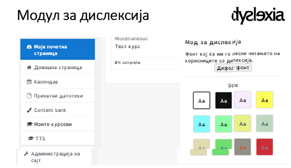 - Плагин за дислексија за студентите со специфични тешкотии во читањето - дислексија. Со користење на овој плагин секој текст во рамките на платформата може да се конвертира во фонтот DyslexicFZF (креиран од Филозофскиот факултет). Овој плагин овозможува промена на бојата на заднината за подобар контраст и олеснето читање на студентите со дислексија.