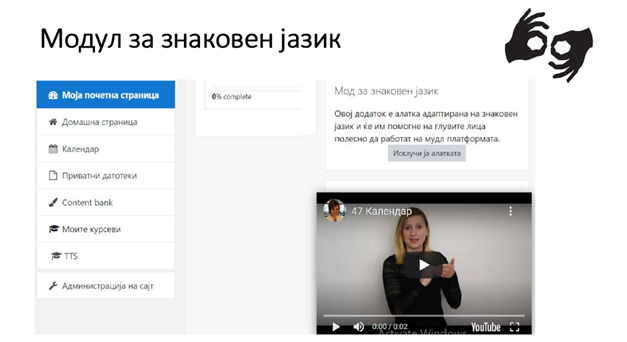 Плагин за знаковен јазик. За креирање на овој плагин беа изработени 150 видеа на знаковен јазик кои беа ембедирани во мудл платформата. На овој начин глувите лица имаат можност да ги следат инструкциите од платформата на македонски знаковен јазик, јазик кој има посебни и различни граматика и синтакса од македонскиот говорен јазик.