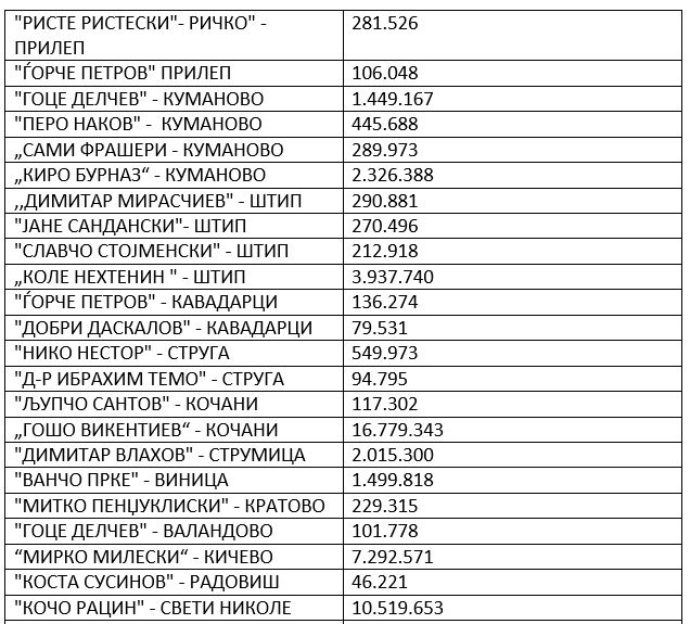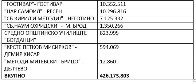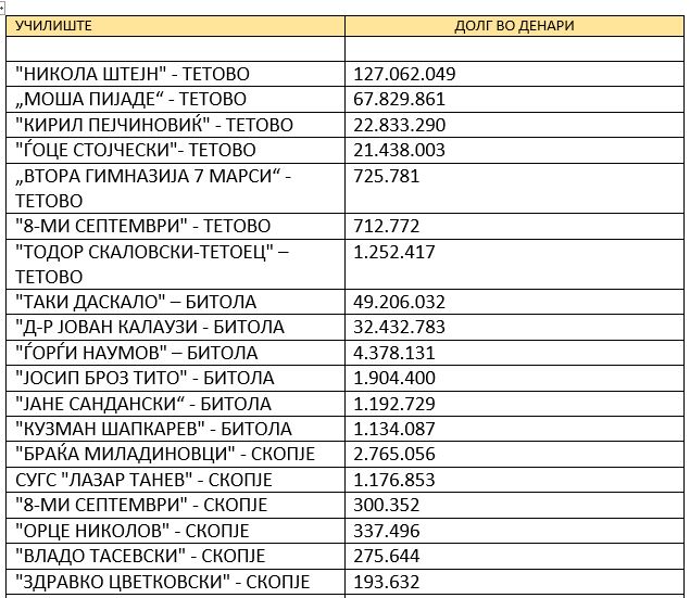 Вкупната сума за долгот на училиштата ја добивме откако ги собравме сите долгови што средните училишта ги пријавиле во Министерството за финансии. Таа изнесува 426.173.803 денари, или речиси 7 милиони евра. Најмногу должи средното медицинско училиште од Тетово - „Никола Штејн“ - 127.062.049 денари.