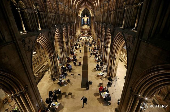 Повеќе катедрали во Велика Британија се користат како центри за вакцинација. Оние што чекаат да бидат вакцинирани уживаат во црковна музика за да се смират.