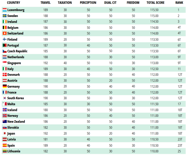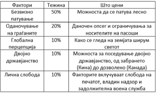 Додека многу рангирања на пасоши се фокусираат исклучиво на патување без визи, овој индекс во своето бодирање ги додава оданочувањето, глобалната перцепција, можноста за добивање двојно државјанство и личната слобода.