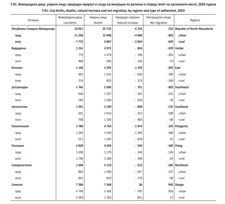 Во извештајот се додава дека природниот прираст е негативен и изнесува -4.690 лица во градските подрачја и -2.034 лица во селските подрачја. Само Скопскиот Регион бележи позитивен природен прираст, а останатите региони бележат негативен природен прираст.