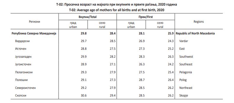 -Просечната возраст на мајката при вкупниот број раѓања во градските подрачја изнесува 29,8 години, а 28,4 години во селските подрачја. Просечната возраст кај првите раѓања во градските подрачја изнесува 28,1 година, а во селските подрачја 25,9 години. При првото раѓање, мајката од селските подрачја е помлада за 2,2 години - стои во извештајот.
