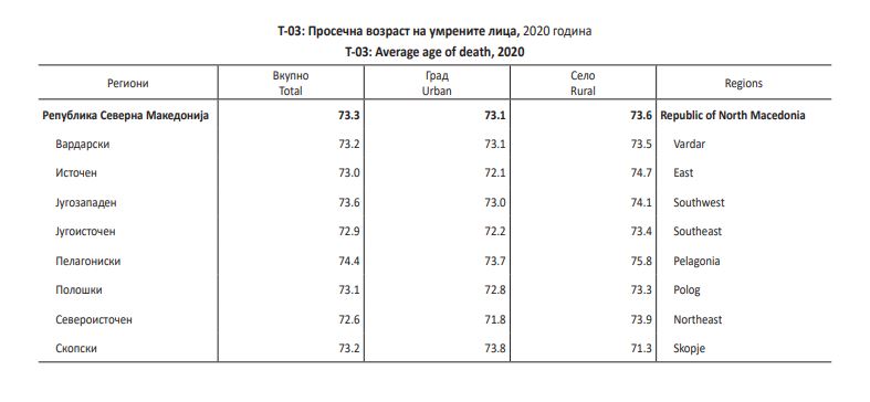 Во градските подрачја умреле 15.948 лица или 61,9%, а 9.807 лица или 38,1% умреле во селските подрачја. Најголемо учество во однос на вкупнот број умрени лица, по региони, има Скопскиот со 28,5%, а најмало Вардарскиот Регион со 8,1%. Во градските подрачја има 64 умрени доенчиња, додека во селските подрачја 44. Просечната возраст на умрените лица во градските подрачја изнесува 73,1 година, а во селските 73,6 години.