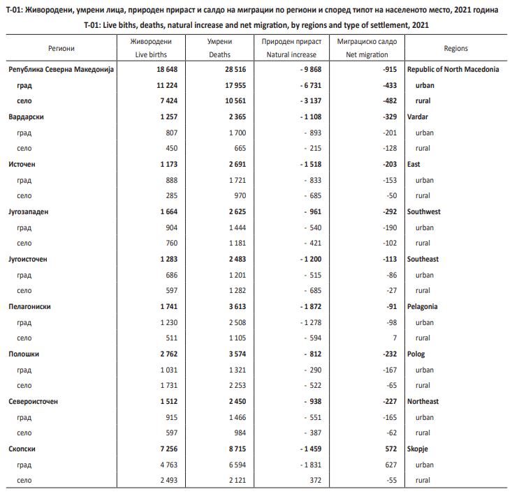 Природниот прираст кај населението e негативен и во градските подрачја изнесува -6 731 лице, a во селските подрачја -3 137 лица.