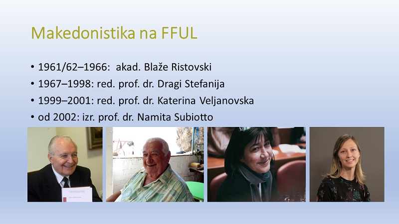 Исклучително големи достигнувања оствари професор Драги Стефанија, кој на македонистиката во Љубљана ѝ посвети цели три децении и кој успеа лекторатот да го надгради во самостојна Катедра за македонски јазик и книжевност, да го зголеми уделот на македонистичките содржини во студиски програми, да подготви неопходната студиска литература, и кој со љубов им/ни го пренесуваше своето големо познавање на македонскиот јазик, литература и култура на своите студенти. Во последните две децении се трудиме да ја зачуваме постигнатата позиција на македонистиката на нашиот факултет, ја негуваме соработката со македонистички центри и институции во Македонија и во регионот (размена на студенти и професори, научни конференции и проекти, списанија и публикации) и со македонски културни друштва во Словенија, а, пред сѐ, настојуваме да мотивираме студенти да ги изучуваат македонскиот јазик и литература...