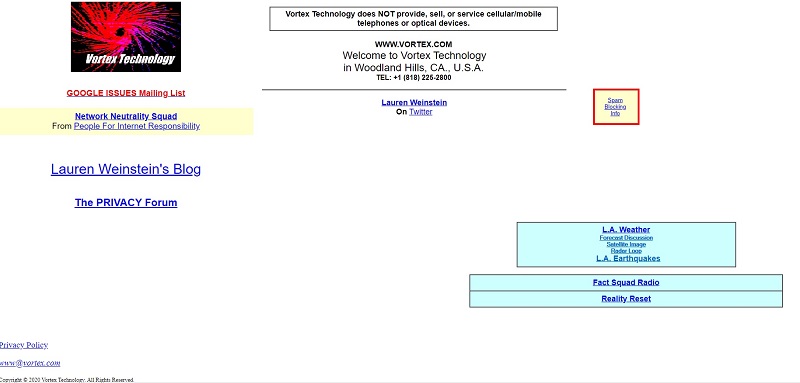 Доменот на Vortex.com бил регистриран на 27 октомври 1986 година. Страницата е со архаичен дизајн, но изгледа дека последен пат била ажурирана во 2017 година.