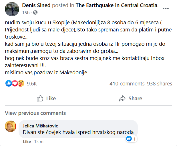 - Ја нудам мојата куќа во Скопје (Македонија), за 8 лица во период од 6 месеци (предност имаат луѓето со мали деца), а подготвен сум да ги платам и патните трошоци. Кога јас бев во тешка ситуација, една личност од Хрватска многу ми помогна, тоа никогаш не можам да го заборавам. Бог нека биде со вас, браќа и сестри, нека ме контактираат сите заинтересирани во инбокс. Мислиме на вас, поздрав од Македонија - напиша Денис.