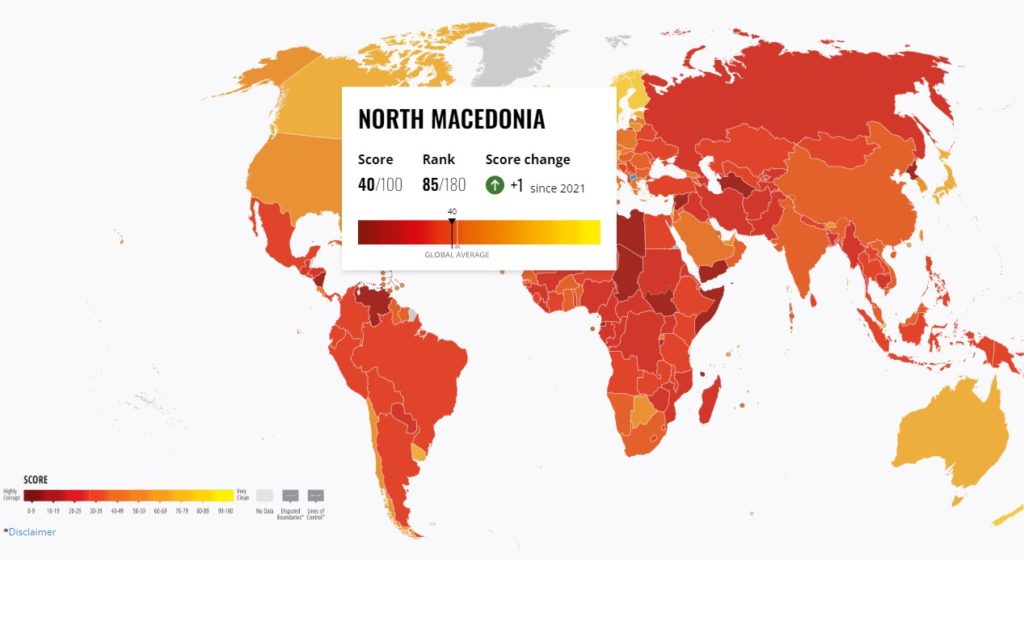 Македонија е рангирана на 85. место меѓу 180 земји во светот според Индексот за перцепција на корупцијата за 2022 година на „Транспаренси интернешенл“.
