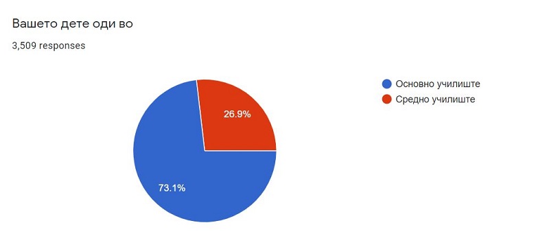 На оваа анкета се вклучија родители чии деца одат во основно и во средно училиште, но сепак, најмногу од нив, 73,1 отсто, или 2.566 испитаници се родители на основци, а 26,9 отсто, или 943 испитаници, се родители на средношколци.