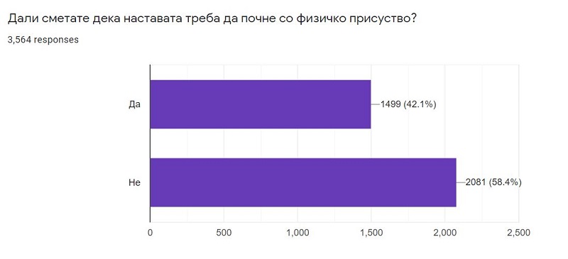 На прашањето дали сметате дека наставата треба да почне со физичко присуство, одговориле вкупно 3.564 родители, од кои негативен одговор дале 2.081 родител, или 58,4 отсто од испитаниците. Потврден одговор дале 1.499 лица, или 42,1 отсто.